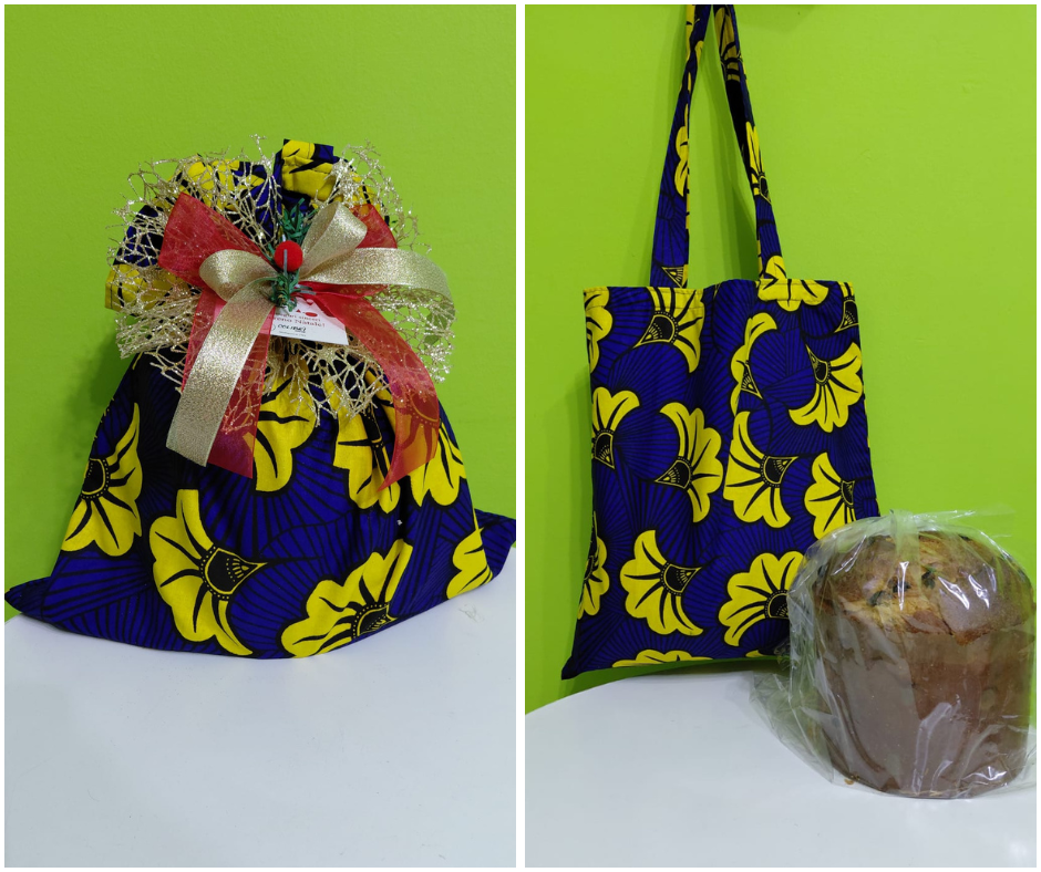 Un classico intramontabile: panettone artigianale da 750g, confezionato in una shopper in stoffa africana colorata e cucita a mano.